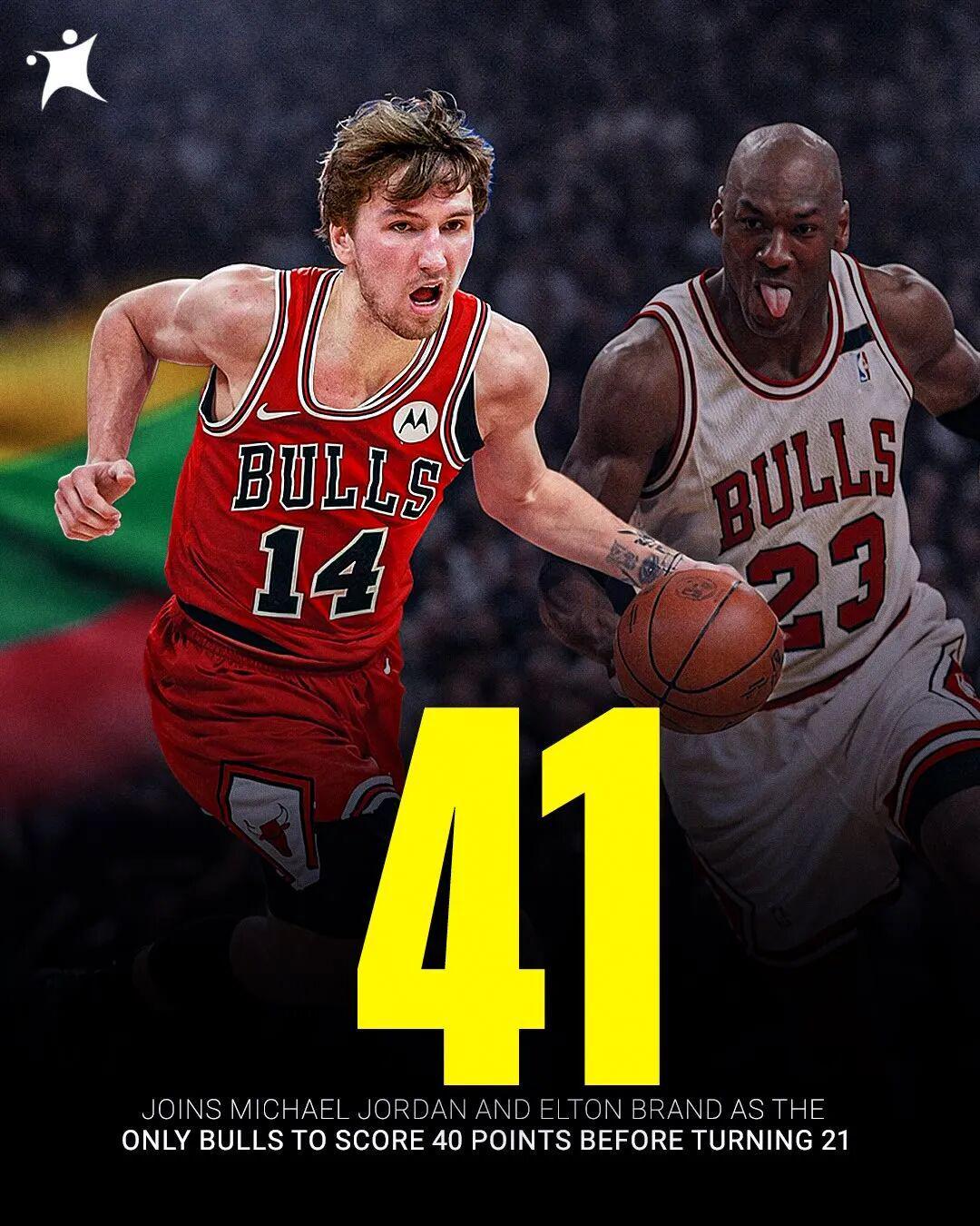 还有一个纪录是:公牛队史上一个在21岁前拿到40+的球员是布兰德,再上一个?迈克尔乔丹。